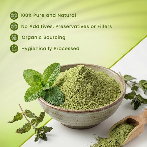 Benefits: Retains its cooling aroma and green color far longer than wilted fresh leaves. Culinary Uses: Used in chutneys, raitas, and cooling summer beverages like jaljeera.