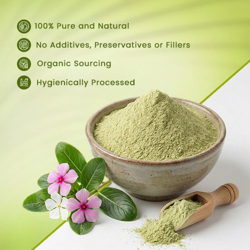 An earthy powder processed from the leaves and stems of the Periwinkle plant, which is recognized for its year-round flowering cycle.